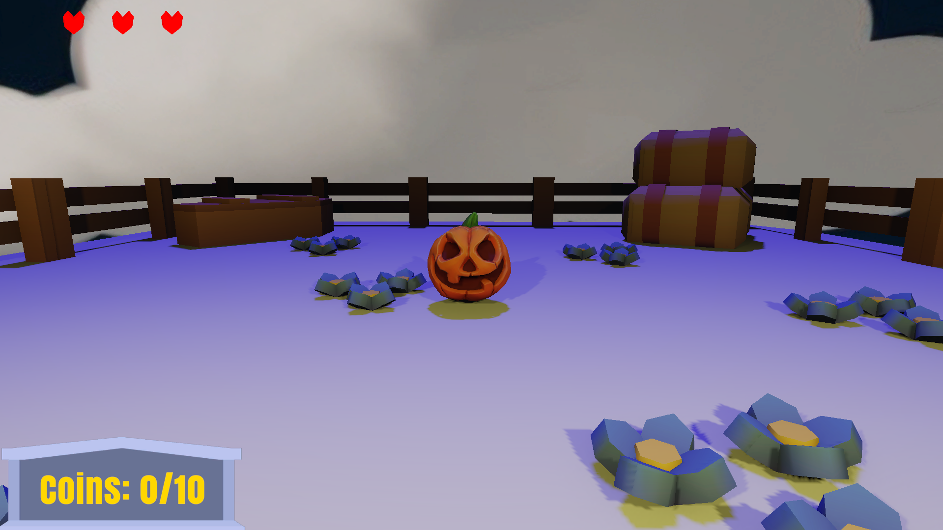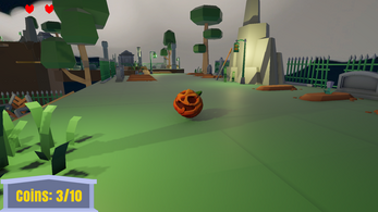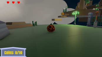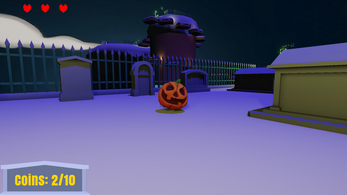 A short 3D platformer with two levels, you play as a pumpkin in a graveyard and must navigate obstacles and kill enemies to collect coins and reach the exit.